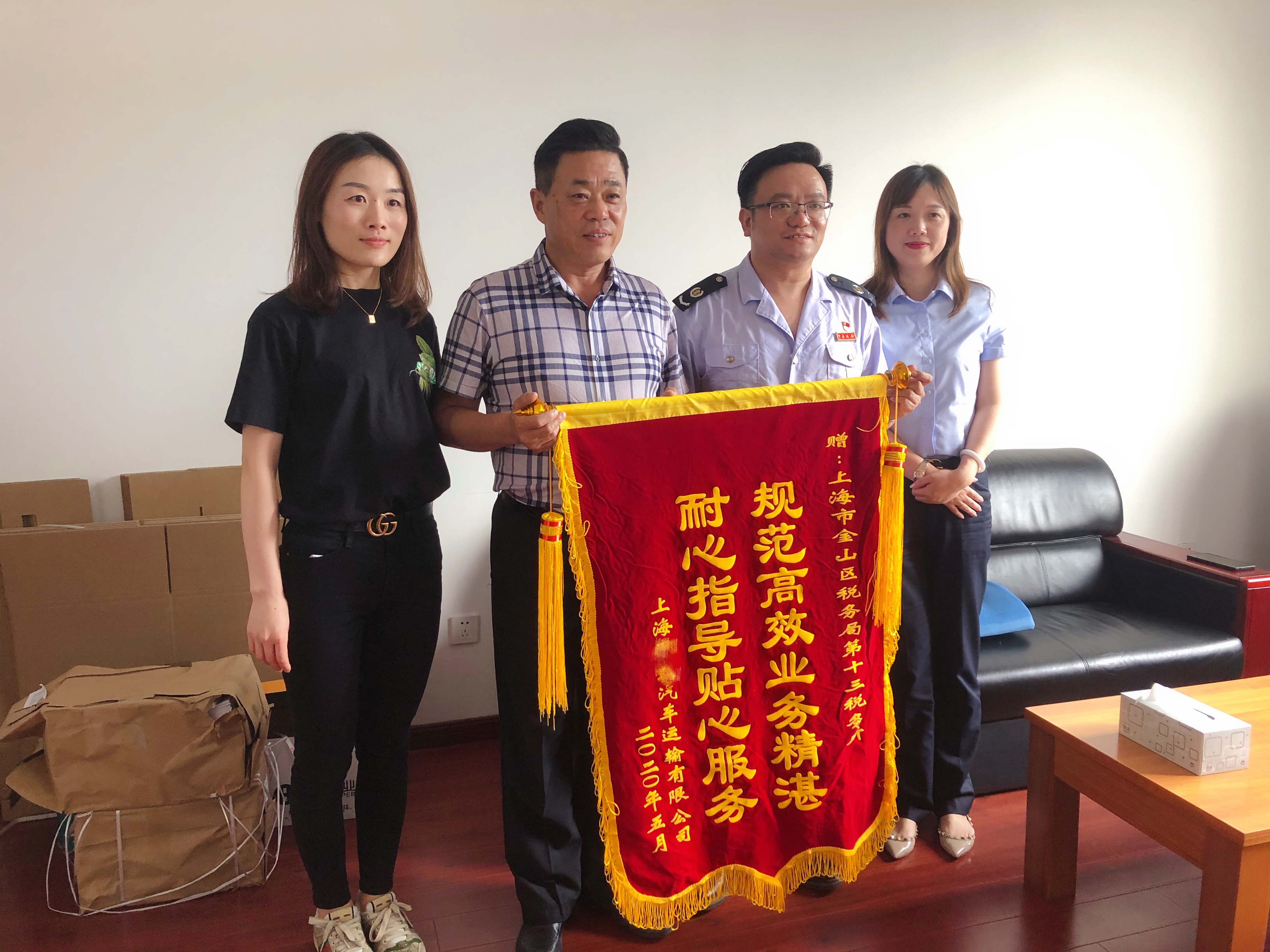近日,注册在二工区经济小区的一家汽车运输企业代表在小区人员的陪同下,把一面绣有“耐心指导贴心服务,规范高效业务精湛”的锦旗送到上海市金山区税务局第十三税务所,衷心感谢税务所为企业问题排忧解难。