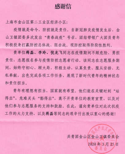 青年有理想有担当,国家就有希望。他们能在关键时刻“站得出”,危难关头“豁得出”,离不开贵单位的教育宣贯,以及对他们参与志愿服务的支持和鼓励。在此,谨向贵单位对此次抗疫工作的大力支持,以及蒋磊等同志的艰辛付出致以衷心的感谢!