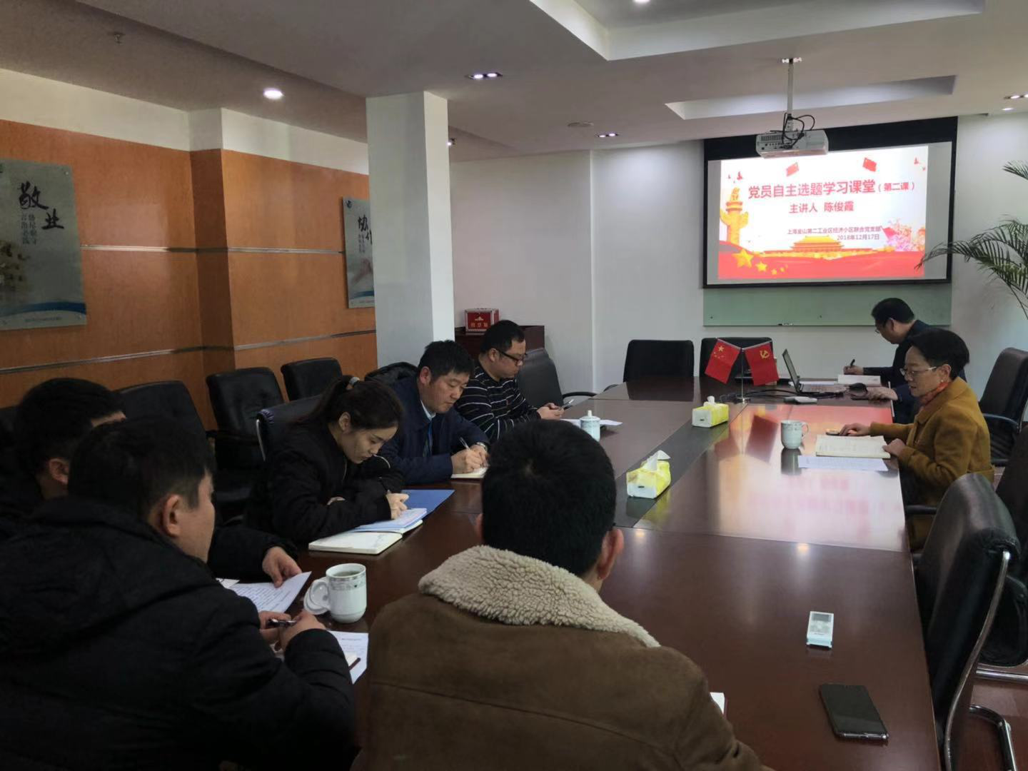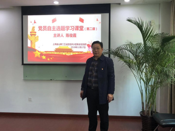 2018年12月17日下午,金山第二工业区经济小区联合党支部党员自主选题学习课堂第二课在二工区经济小区会议室开讲。今天的主讲人是党员陈俊霞,他选取的主题是“党员身份是一辈子的坚守”。