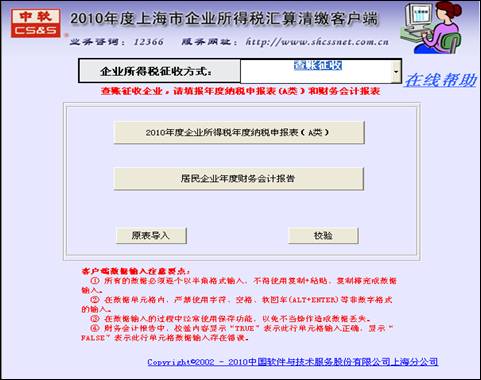 从上海税务网站下载《2010年度上海市企业所得税汇算清缴客户端》后,双击《2010年度上海市企业所得税汇算清缴客户端》图标,出现如下对话框: